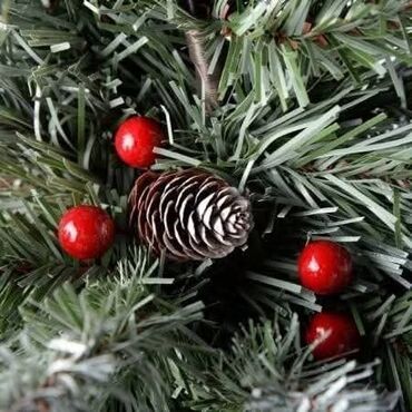 Novogodišnja jelka sa šišarkama i crvenim bobicama predstavlja savršen spoj prirodnog izgleda i praznične elegancije.