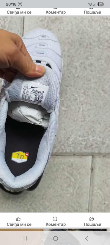 Nike patike – crne, sa belim đonom i Air jastučićem u peti. Gornjište kombinacija brušene kože i tekstila, sa diskretnim Swoosh logoom sa strane. Klasično pertlanje sa ravnim pertlama. Deblji međđo...
