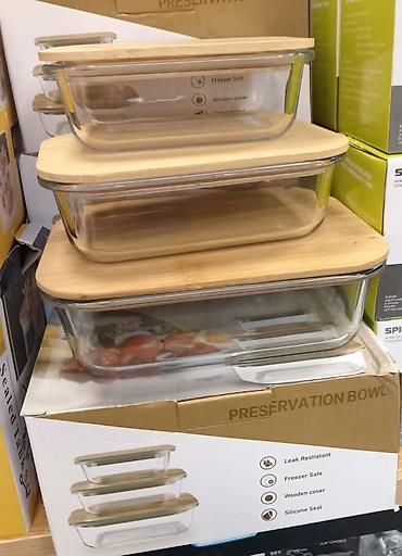 Ovo je set staklenih posuda za čuvanje hrane sa bambusovim poklopcima.