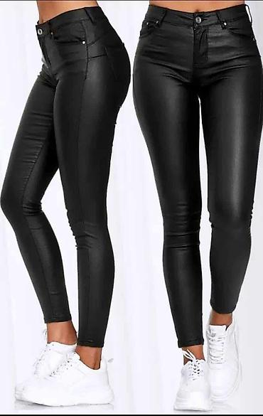 Ženske uske pantalone sa visokim strukom, izgled kože. S, M, L, XL - Kroj: skinny/cevnica, dužina do članka - Struk: visok, sa kopčanjem na dugme i rajsferšlus - Džepovi: prednji dekorativni + funk...