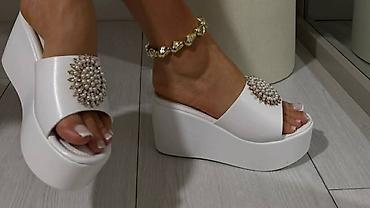 Ženske platforme papuče sa ukrasnim “H” detaljem od cirkona. - Model: klompa/papuča sa otvorenim prstima i širokim gornjištem u obliku slova H ukrašenim sitnim kamenčićima - Visina: podignut đon/p...