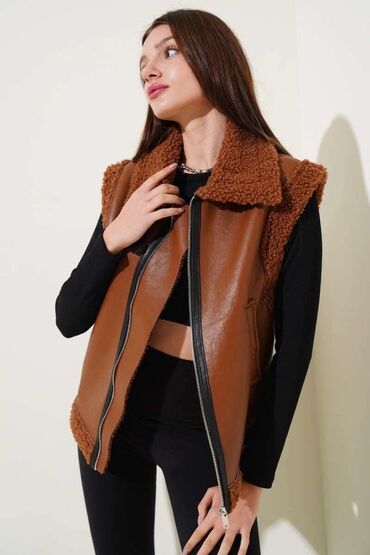 ZARA ženska prsluk-jakna bez rukava, biker stil. - Materijal: crna veštačka koža sa teksturom sa spoljne strane; unutrašnjost, kragna i ivice postavljene mekanim veštačkim krznom u crnoj boji. - A...4 000 RSD