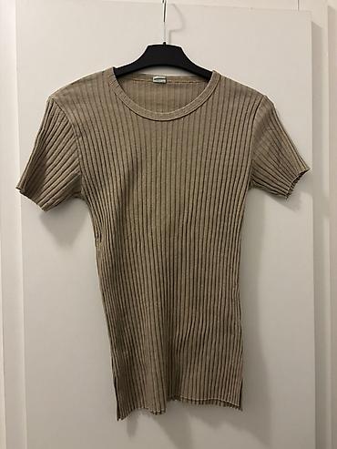 - Majica: kratki rukavi, okrugli izrez, uska silueta, vertikalne rebraste pruge za vizuelno izduženje figure. Duža dužina sa diskretnim bočnim prorezima pri dnu.