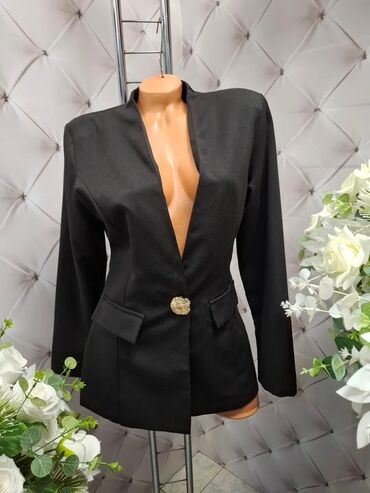 MAX&Co blejzer/sako – elegantan, klasičnog kroja. - Boja: crna - Materijal: somot/pliš (baršunasta tekstura), postava glatka - Kroj: strukiran, dužina preko kukova - Revere: klasični, V-izrez - Ko...