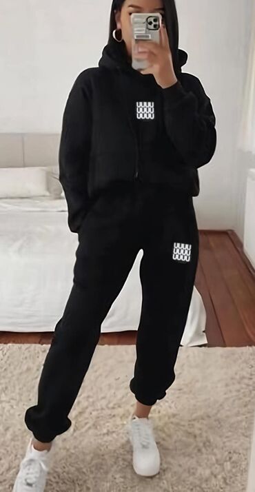 Ženski pleteni komplet – džemper i pantalone sa širokim nogavicama. - Gornji deo: mekani pleteni džemper sa okruglim izrezom i dužim rukavima. Dekorisan motivima – bele srcolike aplikacije ili sit...