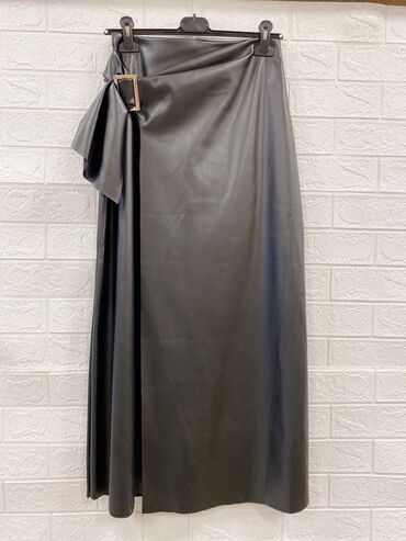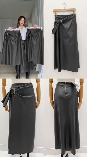 Ženska mini suknja od eko kože - Materijal: meka, glatka eko koža sa diskretnim sjajem - Kroj: slim fit, visoki struk - Dizajn: asimetrično preklapanje napred sa drapiranim naborima koji vizuelno ...