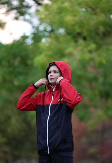 Dečija Nike jakna sa kapuljačom – crvena - Brend: Nike (Swoosh logo na grudima i etiketa na unutrašnjosti) - Model: lagana jakna sa rajsferšlusom celom dužinom - Boja: intenzivno crvena sa belim d...