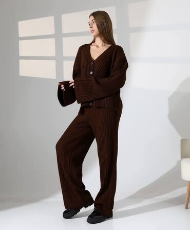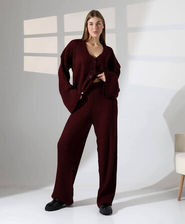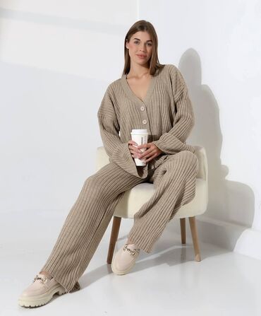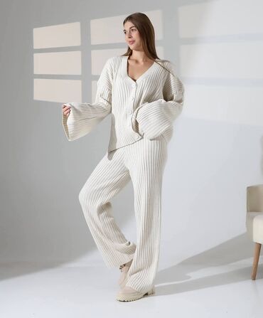 Ženski pleteni komplet – džemper i pantalone sa širokim nogavicama. - Gornji deo: mekani pleteni džemper sa okruglim izrezom i dužim rukavima. Dekorisan motivima – bele srcolike aplikacije ili sit...