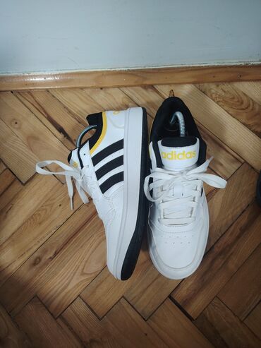 Adidas patike – nizak model, bele sa crnim detaljima i žutim akcentima.