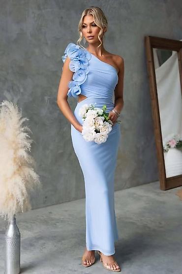 Dugačka ženska haljina svetloplave boje, bez rukava, sa okruglim izrezom. Karakteriše je rajsferšlus na dekolteu, kao i slojeviti dizajn sa naborima koji dodaju volumen i lepršavost. Idealna za sva...