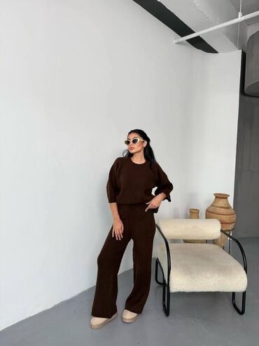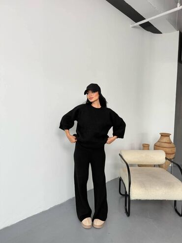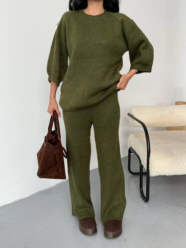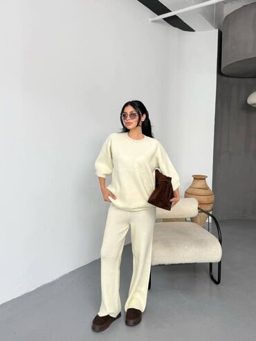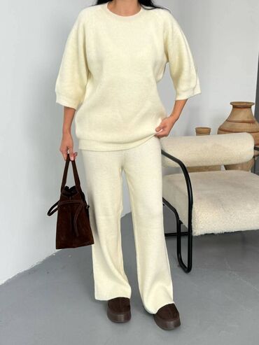 Ženski pleteni komplet – džemper i pantalone sa širokim nogavicama. - Gornji deo: mekani pleteni džemper sa okruglim izrezom i dužim rukavima. Dekorisan motivima – bele srcolike aplikacije ili sit...