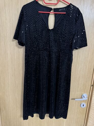Elegantna crna haljina sa sjajnim tačkicama (štras/sekvin efekat).