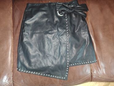 Veštačka kožaCrna mini suknja od eko-kože sa ukrasnim metalnim nitnama duž poruba i prednjeg preklopa. Asimetričan kroj napred, sa preklopom koji se zatvara kaišem s velikom metalnom alkom i mašnom sa strane. Pozadi se zatvara vidljivim rajsferšlusom. Blago A kroj, glatka tekstura, bez džepova. Idealna za večernje kombinacije ili urbani rok stil; lako se kombinuje uz čizme ili štikle.