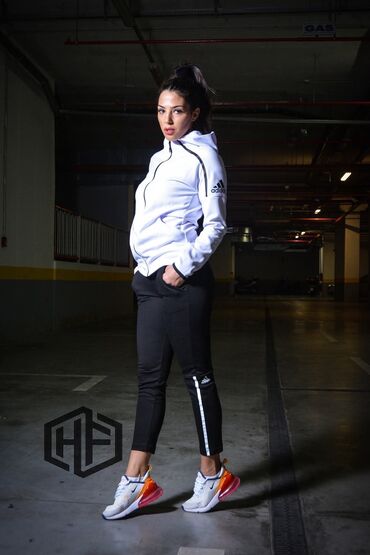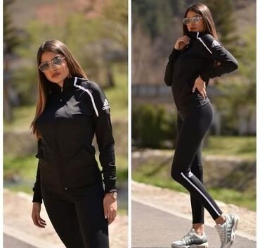 Ženski komplet trenerke sa rajsferšlusom – dvodelni set - Gornji deo: sportska jakna sa punim rajsferšlusom, raglan rukavi, kontrastne bočne panele i tri pruge duž rukava. Dva funkcionalna džepa s...