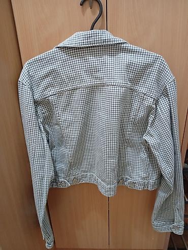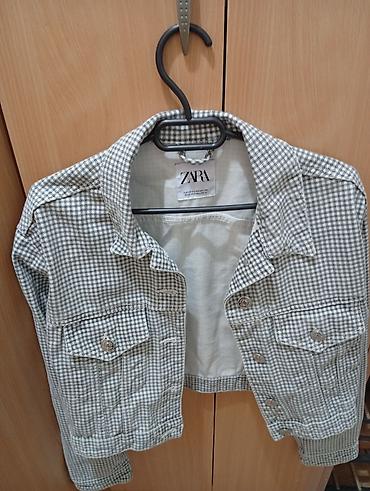 ZARA kratka jakna sa sitnim karo (gingham) dezenom u sivo‑belim tonovima.