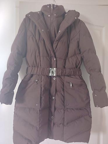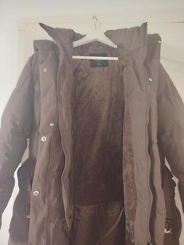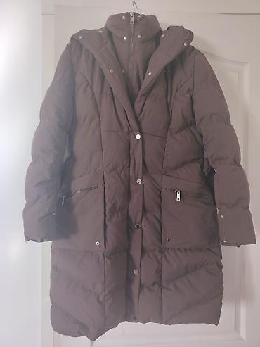 Ženska zimska jakna/parka, braon boje, dužina do iznad kolena.