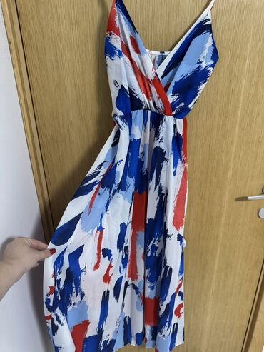 Ženska midi haljina sa V-izrezom i apstraktnim printom u nijansama plave, crvene i bele. Haljina je bez rukava, sa tankim bretelama i elastičnim strukom koji naglašava figuru. Donji deo haljine je lepršav i pada slobodno, idealan za letnje dane. Dizajn sa preklapanjem na grudima doprinosi ženstvenom izgledu. Pogodna je za razne prilike, od opuštenih šetnji do večernjih izlazaka.