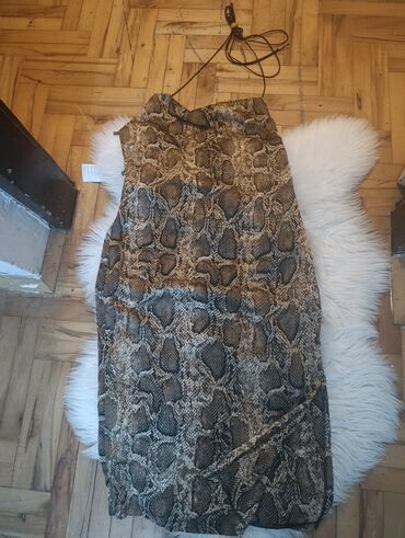 Zara haljina sa životinjskim printom (zmijski dezen) - Model: uska midi/dužina ispod kolena - Kroj: bez naramenica (strapless), lagano strukturisan gornji deo - Šara: zmijski print u tonovima bež,...