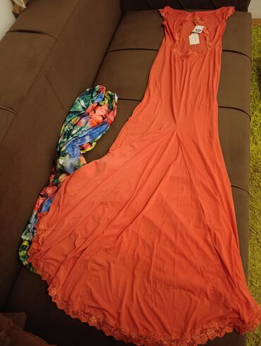 Damski satenski set za spavanje – spavaćica i kimono ogrtač. - Materijal: glatki, sjajni saten sa blagim padom. - Boja: topla šampanj/karamel nijansa. - Spavaćica: mini dužina, V-izrez, tanke bret...