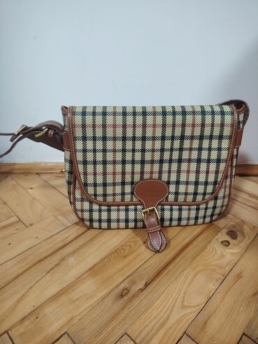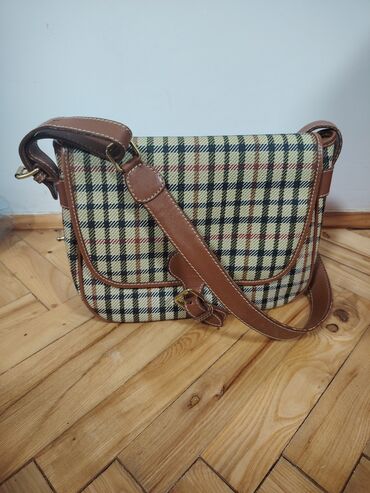 - Materijal: tekstil sa klasičnim kariranim (tartan) uzorkom u bež, crnoj i braon boji; ivice, kaiš i detalji od braon eko/kože sa dekorativnim štepom