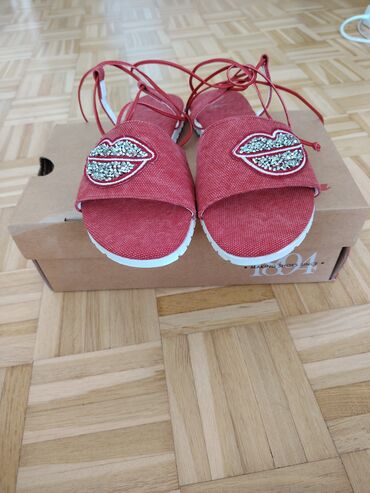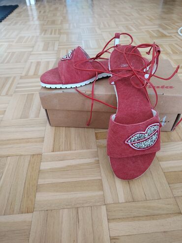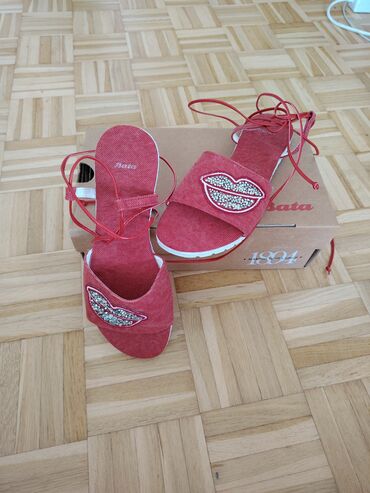 PlatnoŽenske sandale Bata, crvene boje, sa vezivanjem oko zgloba. Gornji deo od tekstila sa širokim kaišem i aplikacijom usana ukrašenom sitnim svetlucavim kamenčićima. Bela, blago profilisana gumena đon ploča za dobro prianjanje. Ravne, lagane i udobne za leto. Dizajn otvorenih prstiju. U kompletu sa originalnom kutijom. Idealne za ležerne i trendi kombinacije.