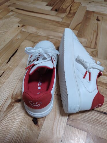 - Boja: bela osnova, crveni unutrašnji deo i peta, crvene kapice na pertlama i mali crveni srcići sa strane
