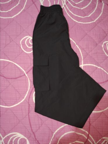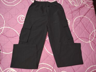 CrnaCrne cargo pantalone sa širokim krojem. Elastičan pojas sa lastišem za udobno pristajanje bez kaiša. Dva velika bočna cargo džepa sa preklopom (po jedan na svakoj nogavici), praktična za nošenje sitnica. Ravne, dugačke nogavice. Materijal lagan i gladak na dodir, pogodan za svakodnevno nošenje, rad ili aktivnosti na otvorenom. Neutralna crna boja lako se kombinuje sa različitim stilovima. Na stanju u S i M veličini.