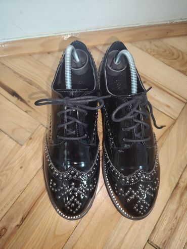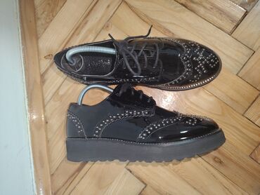 UpotrebljenоŽenske lakovane cipele sa pertlama, crne boje, brogue stil sa ukrasnim perforacijama i metalnim nitnama po šarama i ivici đona. Gornjište od sjajnog lak materijala, zaobljeni vrh. Deblji gumeni platforma-đon sa blagim talasastim profilom za stabilnost i udobnost. Klasično vezivanje sa crnim pertlama, unutrašnjost sa uloškom sa rupičastom teksturom. Elegantno-urbani model pogodan za kombinovanje uz farmerke, suknje ili poslovne autfite.