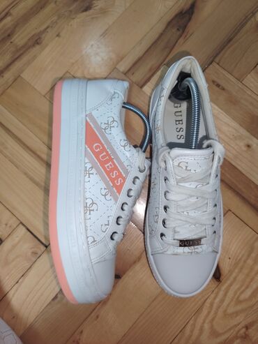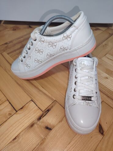 - Boja: bela osnova, GUESS monogram u bež tonovima, koralno-ružičasti akcenti na bočnoj traci i na donjem rubu/ivici đona