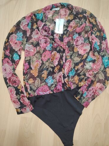 - Dizajn: prozračan, šifonasti gornji deo sa bogatim cvetnim motivom u ružičastim, tirkiznim, žutim i zelenim tonovima; jednobojni donji deo bodija u crnoj boji