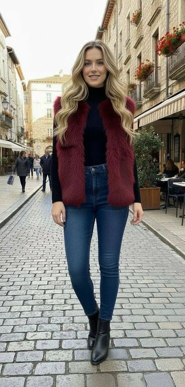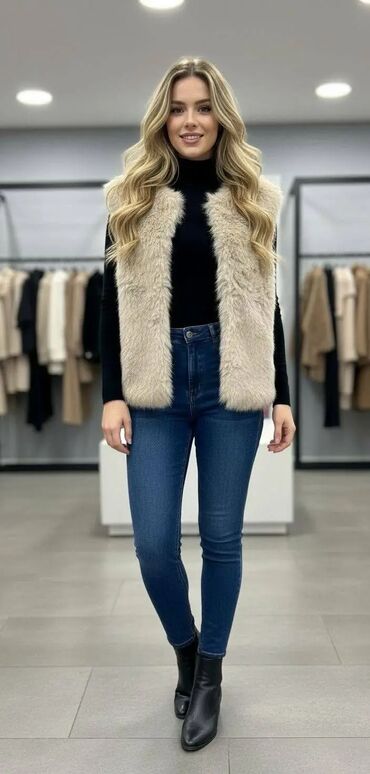 Ženski prsluk od veštačkog krzna – bez rukava, ravnog kroja, mekane i guste teksture. Dužina do kukova, otvoren prednji deo bez kopčanja za slojevito kombinovanje. Idealno uz rolke, košulje i haljine, za svakodnevne i večernje kombinacije. Dostupan u više modernih boja prikazanih na fotografijama: bež, bordo, tamno braon i crna. Lagan, topao i prijatan na dodir, lako se uklapa uz farmerke i čizme. Savršen modni detalj koji dodaje volumen i eleganciju zimskim i jesenjim outfitima.