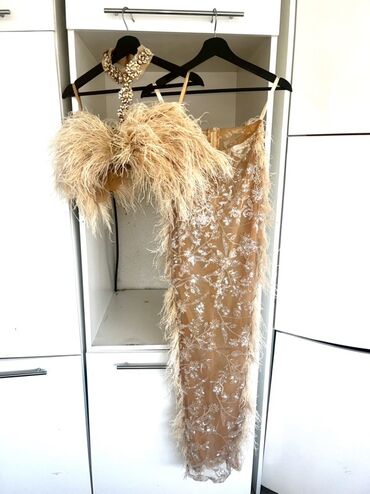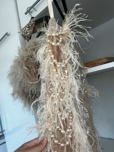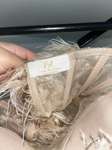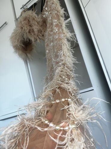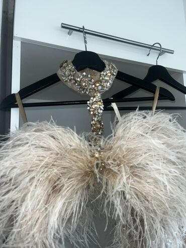 - Gornji deo: kratki top od bogatog perja u nijansi šampanjca. Oko vrata raskošan, odvojiv kragnasti ukras sa velikim kristalima u zlatnim i bisernim tonovima (kopčanje pozadi).