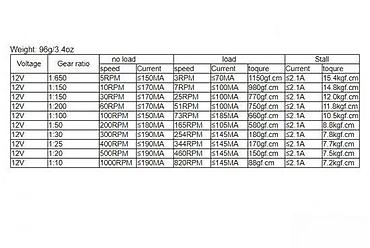 Napomena: Specifikacije referencirane iz priložene tabele za varijantu 12V/1:10. Druge brzine i odnosi prenosa postoje u seriji (5–1000 rpm) sa različitim momentima i strujama.