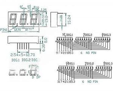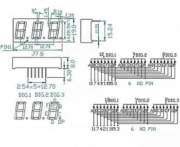 - Obeležene funkcije segmenata: A, B, C, D, E, F, G, DP za svaku cifru; nezavisna kontrola DIG1, DIG2, DIG3 za multipleksni rad