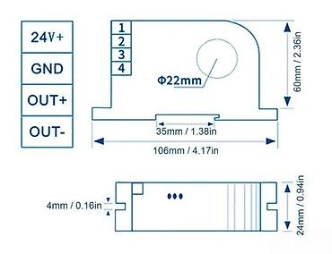 - Priključci: 4-pinski terminali (24V+, GND, OUT+, OUT-)