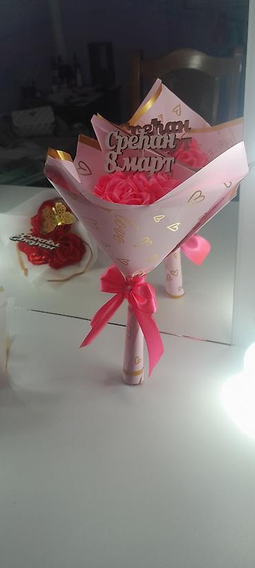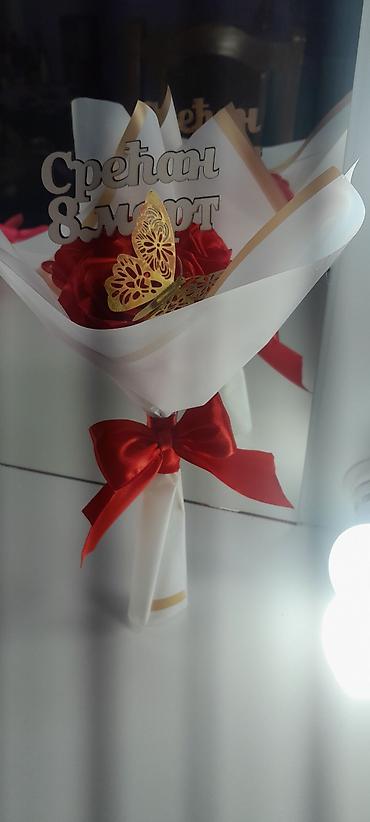 - Elegantno aranžirani buketi u poklon-papiru (belo sa zlatnim ivicama ili roze sa zlatnim srcima i natpisima).