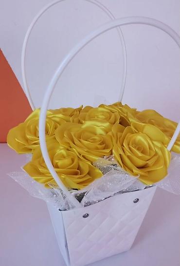 Bukет od crvenih “svilenih” ruža – dekorativni aranžman - Raskošan okrugli buket sastavljen od velikog broja ruža napravljenih od sjajne satenske trake. - Intenzivna crvena boja, postojana i neble...