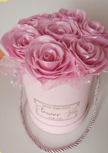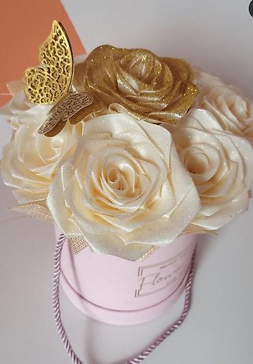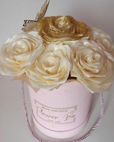 Dekorativna kutija sa satenskim ružama - Elegantna ovalna poklon-kutija u ružičasto-zlatnoj nijansi sa reljefnom teksturom i satenskom trakom/mašnom sa strane. - Ispunjena aranžmanom ruža ručno ra...
