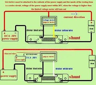 Pogodno za napajanja, DC motore, punjače, solarne sisteme i druge DC aplikacije gde je potrebno pouzdano praćenje struje. U kompletu je digitalni ampermetar; šant je predviđen za serijsko povezivanje prema šemi na slici.