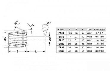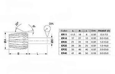 - Dizajn: dužina i prečnici prema ER32 specifikaciji; kompatibilna sa standardnim ER32 navojnim maticama i držačima
