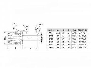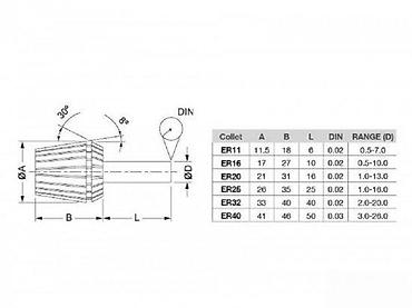 - ER40: A ≈ 41 mm, B ≈ 46 mm, L ≈ 50 mm, ØD prema opsegu 3–26 mm