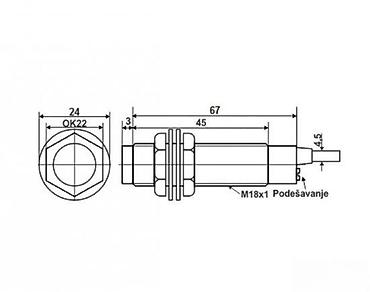 - Mehaničke dimenzije (aproks.): ukupna dužina oko 67 mm, navojni deo oko 45 mm; ključ 22 mm; prečnik glave ~24 mm