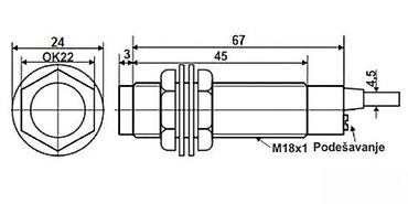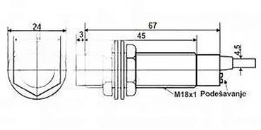 - Kućište: cilindrično, navoj M18x1, dužina senzora ~67 mm