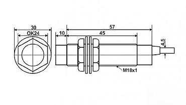 - Dimenzije tela: ukupna dužina oko 57 mm; dužina navoja ~45 mm; prečnik senzorske glave M18