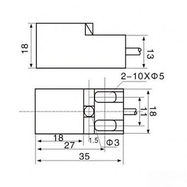 - Kompaktne dimenzije kućišta, prikazane na tehničkom crtežu (dužina tela ~35 mm, širina/visina ~18 mm; izlazno vratilo/sonda Ø3 mm; referentne mere za montažu i zazore u crtežu)