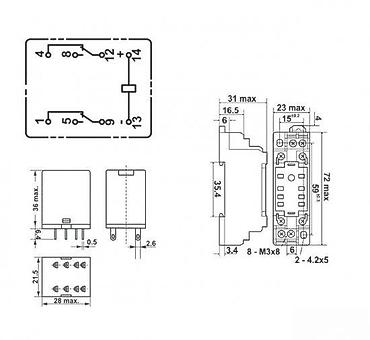- Dimenzije releja približno: 36 mm visina, 28 x 21.5 mm osnova; podnožje oko 72 x 23 x 31 mm (maks.)