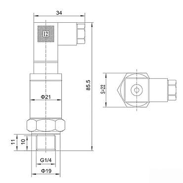 - Dimenzije (približno, prema crtežu): ukupna visina 85,5 mm; širina glave 22 mm; prečnik tela 21 mm; šesterougao 22 mm; dužina navoja 10–11 mm; prečnik priključka 19 mm