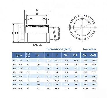 - LM8UU: D=15, L=24, B=17.5, W=1.1, D1=14.3, CN=265 N, CoN=402 N, 4 reda kuglica