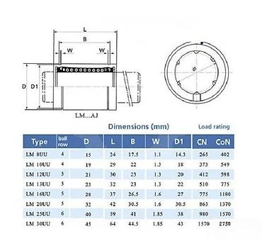 - LM8UU: D=15, L=24, B=17.5, W=1.1, D1=14.3, 4 reda kuglica, dinamička CN 265 N, statička CoN 402 N