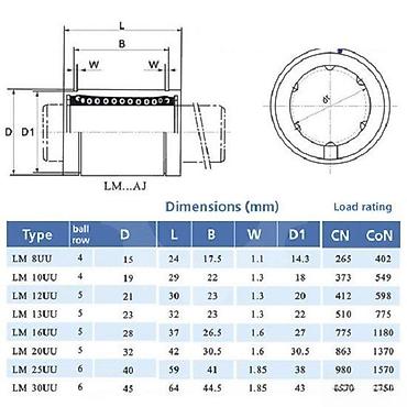 - Nosivosti (primeri, dinamička/ statička, N): LM8UU 265/402; LM10UU 373/549; LM12UU 412/598; LM13UU 510/775; LM16UU 775/1180; LM20UU 863/1370; LM25UU 980/1570; LM30UU 1570/2750